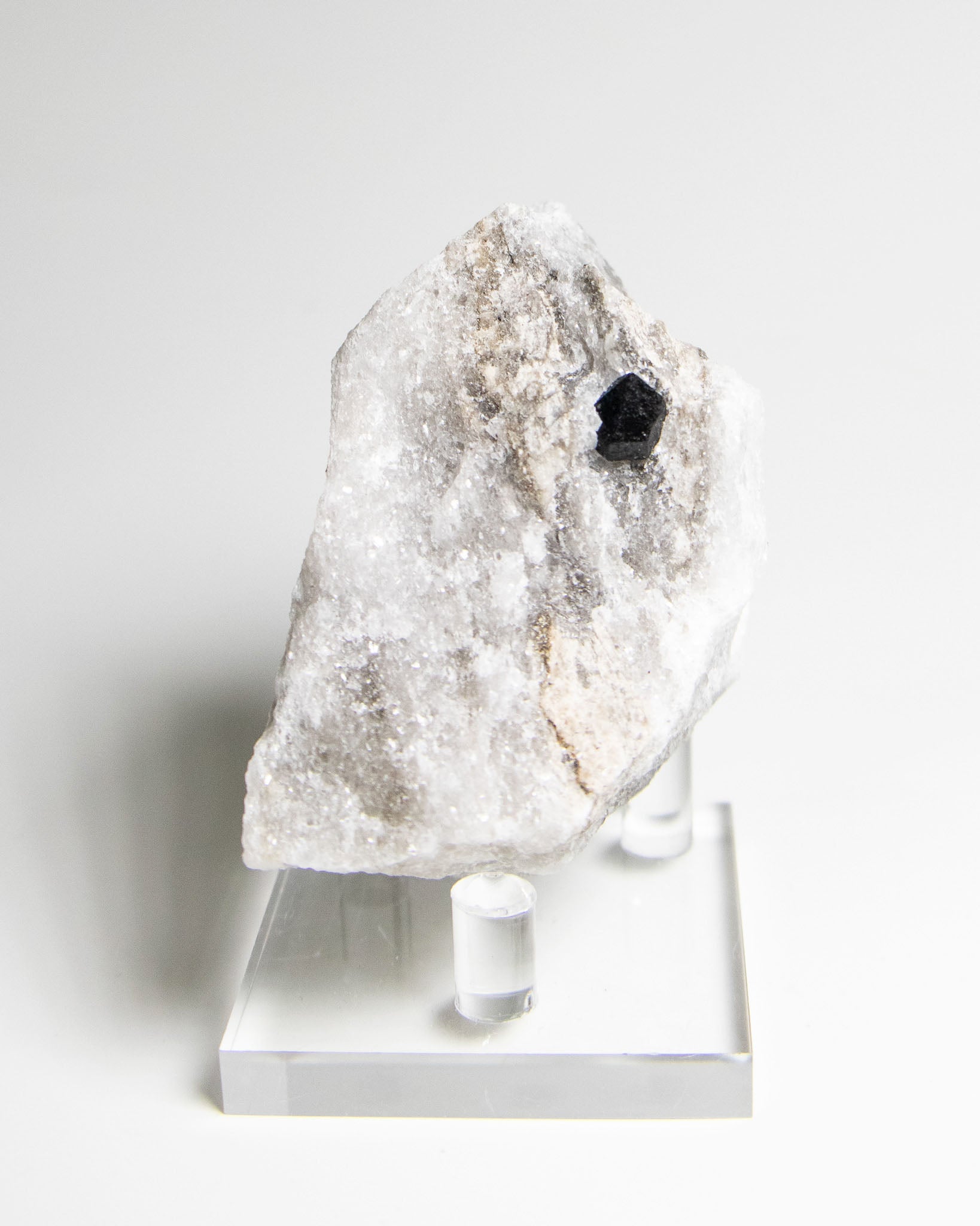 黑色來源於細緻的石墨包裹體,使晶體呈現柔和而深邃的黑度。水晶多呈雙尖(俗稱閃靈水晶),常見一端嵌於硬石膏中,另一端清晰露出。硬石膏天然的光澤,如黑水晶的閃亮幻夢,更給人溫柔包容的療癒力,黑白灰協調的寧靜感,更能在療癒領域幫助安定。